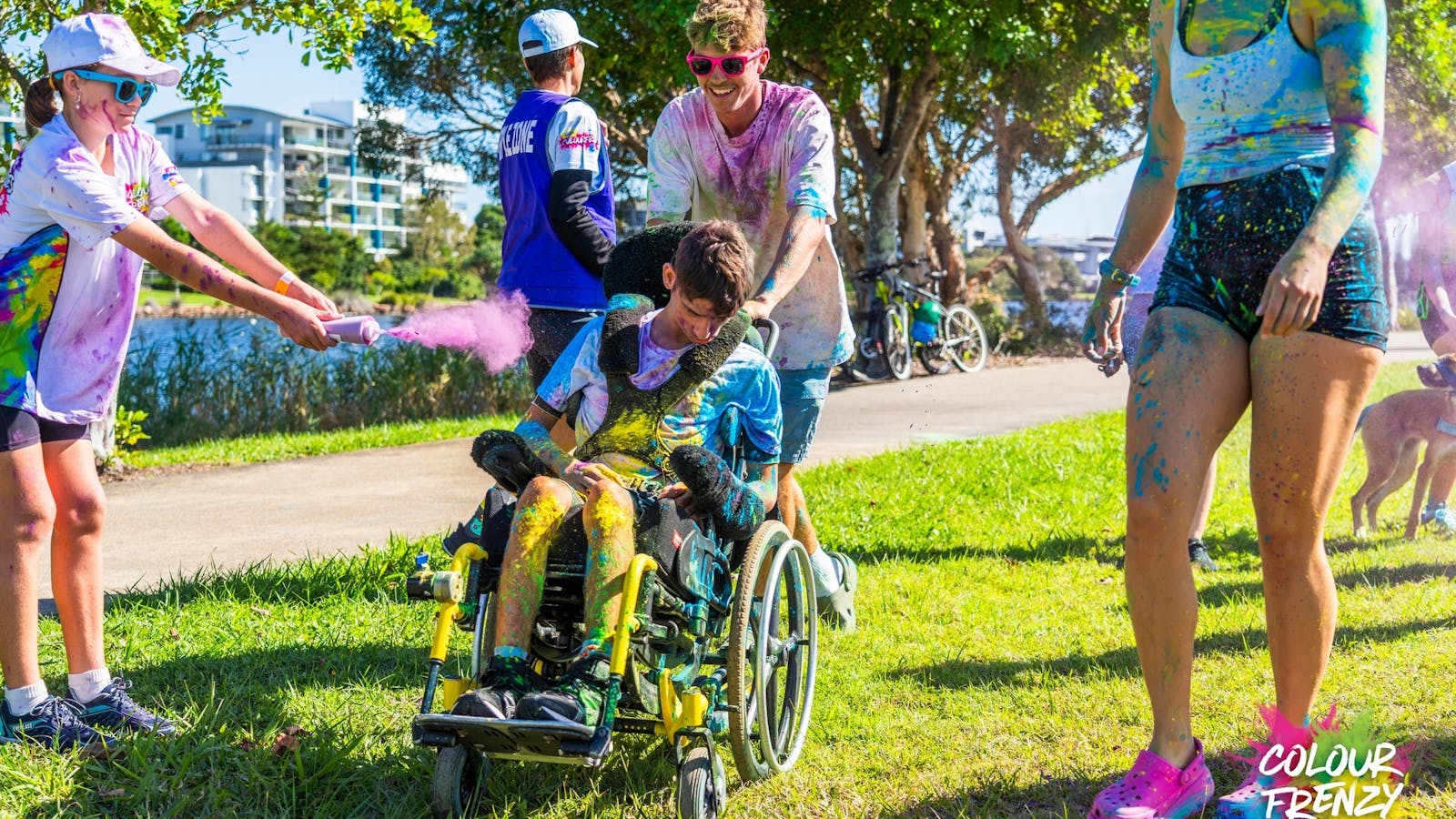 Colour Frenzy creates lasting memories for families, friends and individuals. The event welcomes all abilities and includes free entry for companions and carers. Dogs are welcome too, adding extra fun for everyone.