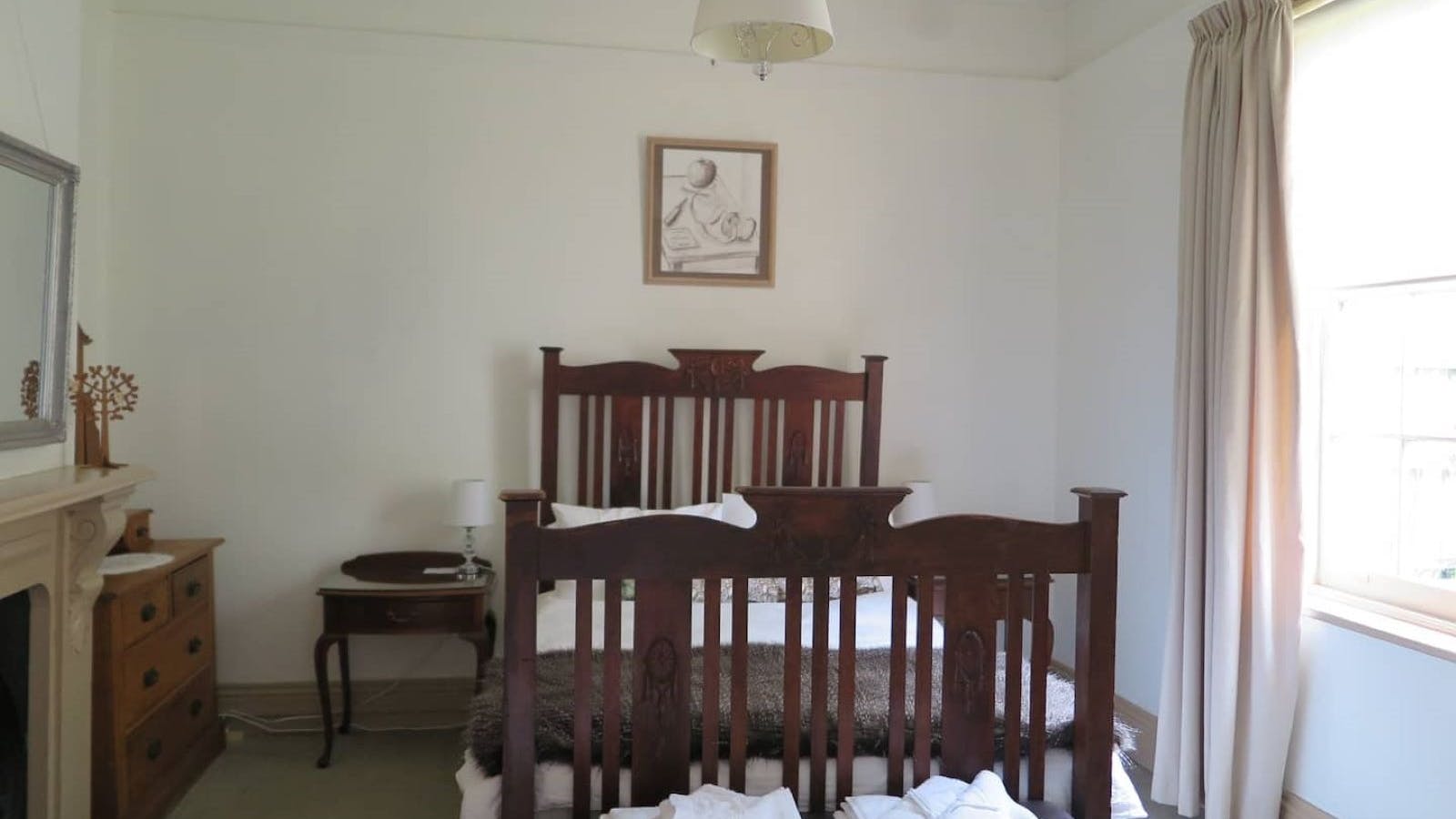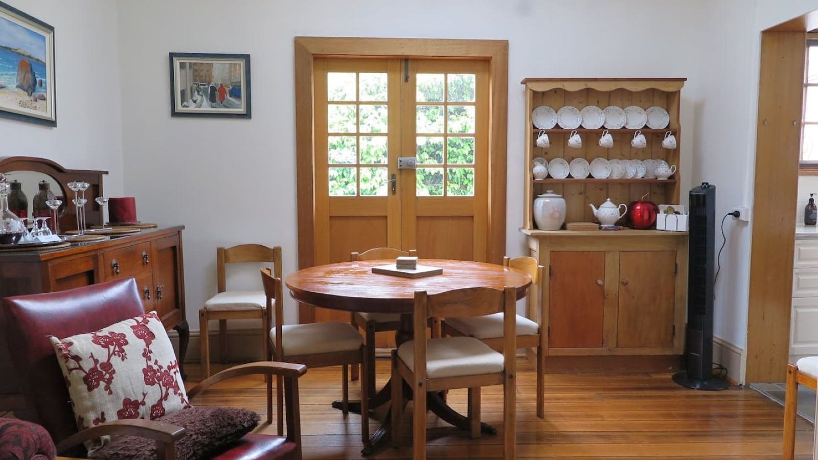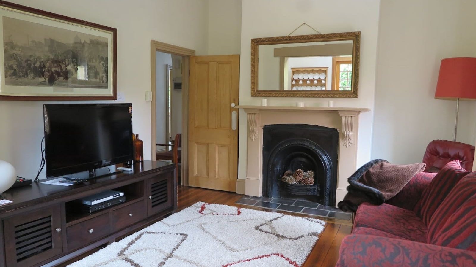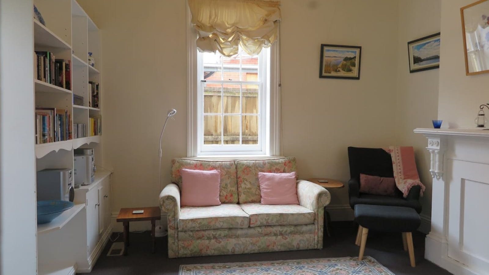 Downstairs are two spacious bedrooms. There is a Queen bed in one and Double in the other with some lovely original features, including ornamental fireplaces and furnished with fantastic antique pieces. The combined main lounge and dining room leads onto the modern, galley style kitchen with an oven, dishwasher and plenty of bench space. There is an additional sitting room with a vast selection of books and games. The laundry with a washing machine and dryer and the updated bathroom and separate toilet are also on the lower level.
