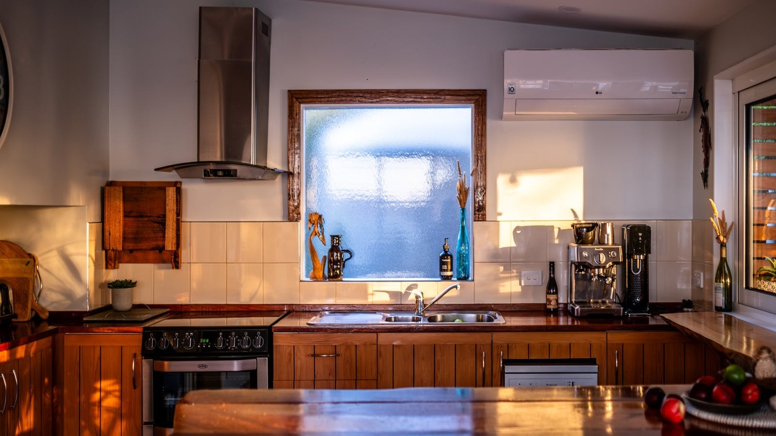 There is a funky round couch in the lounge room and a wood fire to curl up in front of while looking at the view (the fireplace can be used from May to September only). There is also a reverse air conditioning unit.