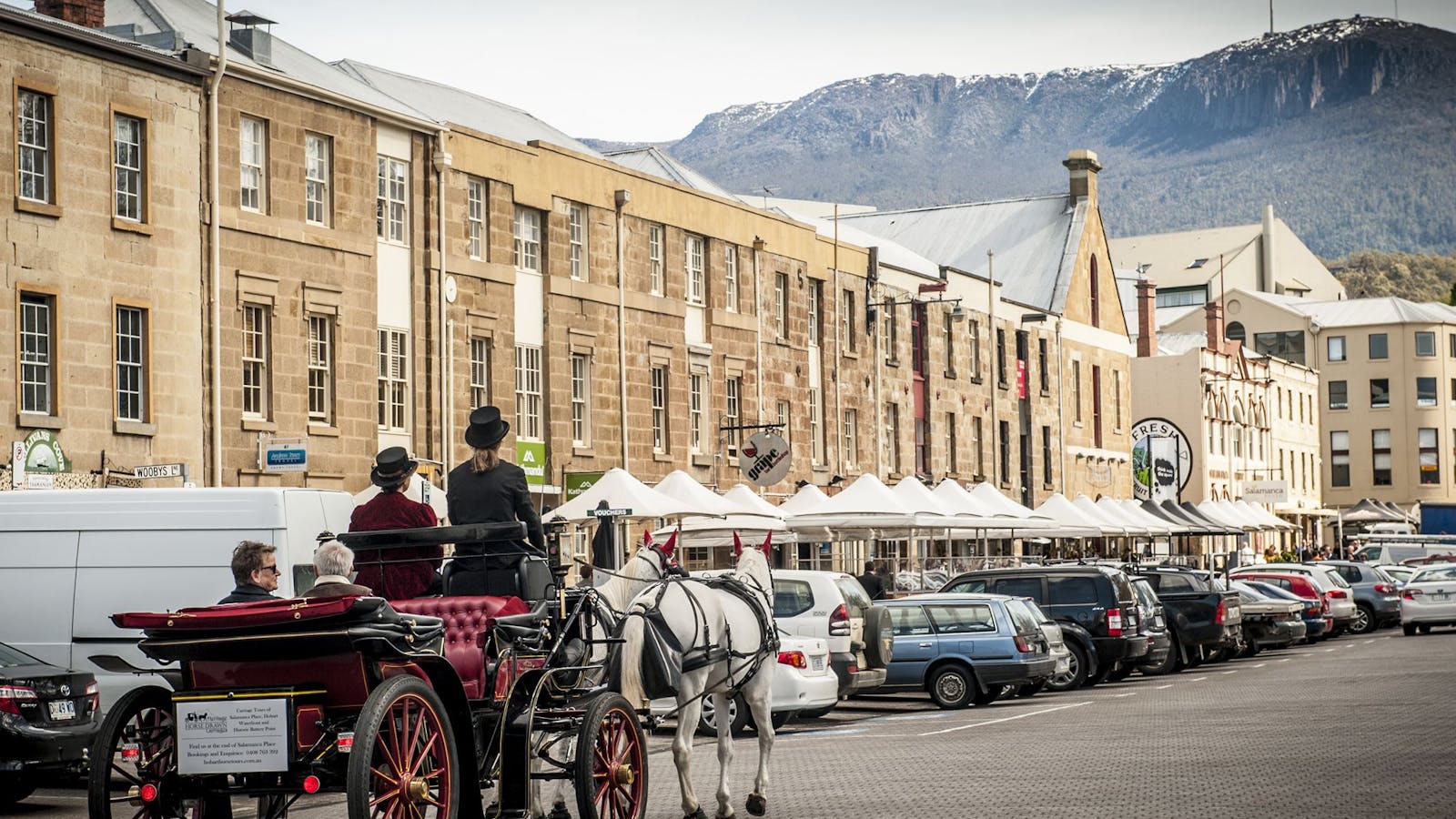 Experience the romance of a bygone era by taking a leisurely carriage ride through the unique historic areas of Battery Point, Hobart Waterfront and Salamanca Place.