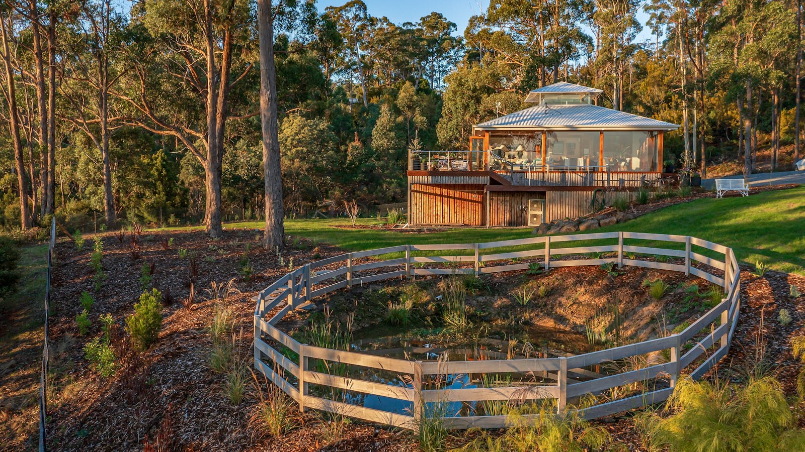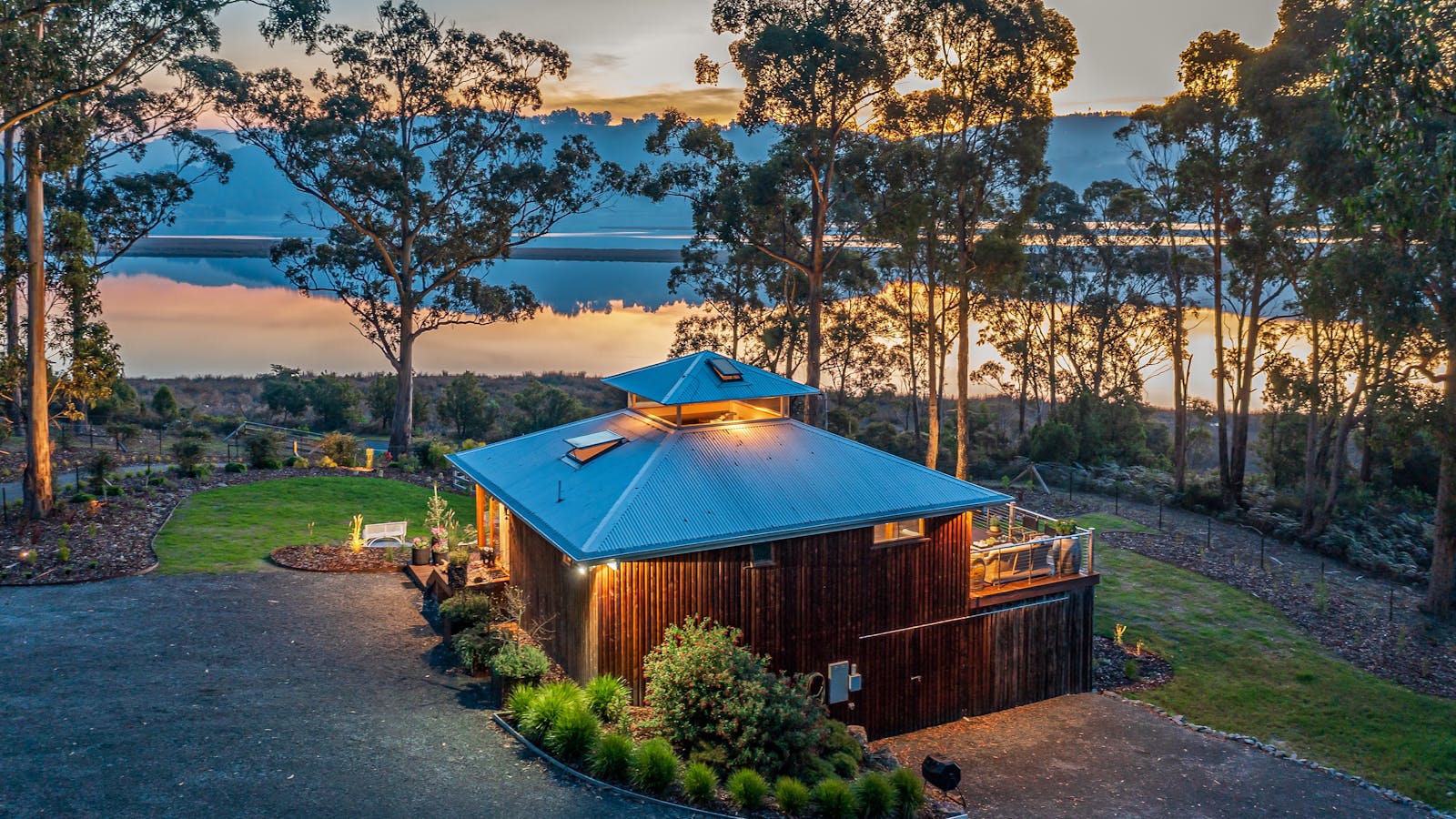 The architecturally designed dwelling is a haven for couples and solo travellers. Nestled on the banks of the Huon River close to the charming Cygnet village in southern Tasmania, just forty-five minutes south of Hobart.
