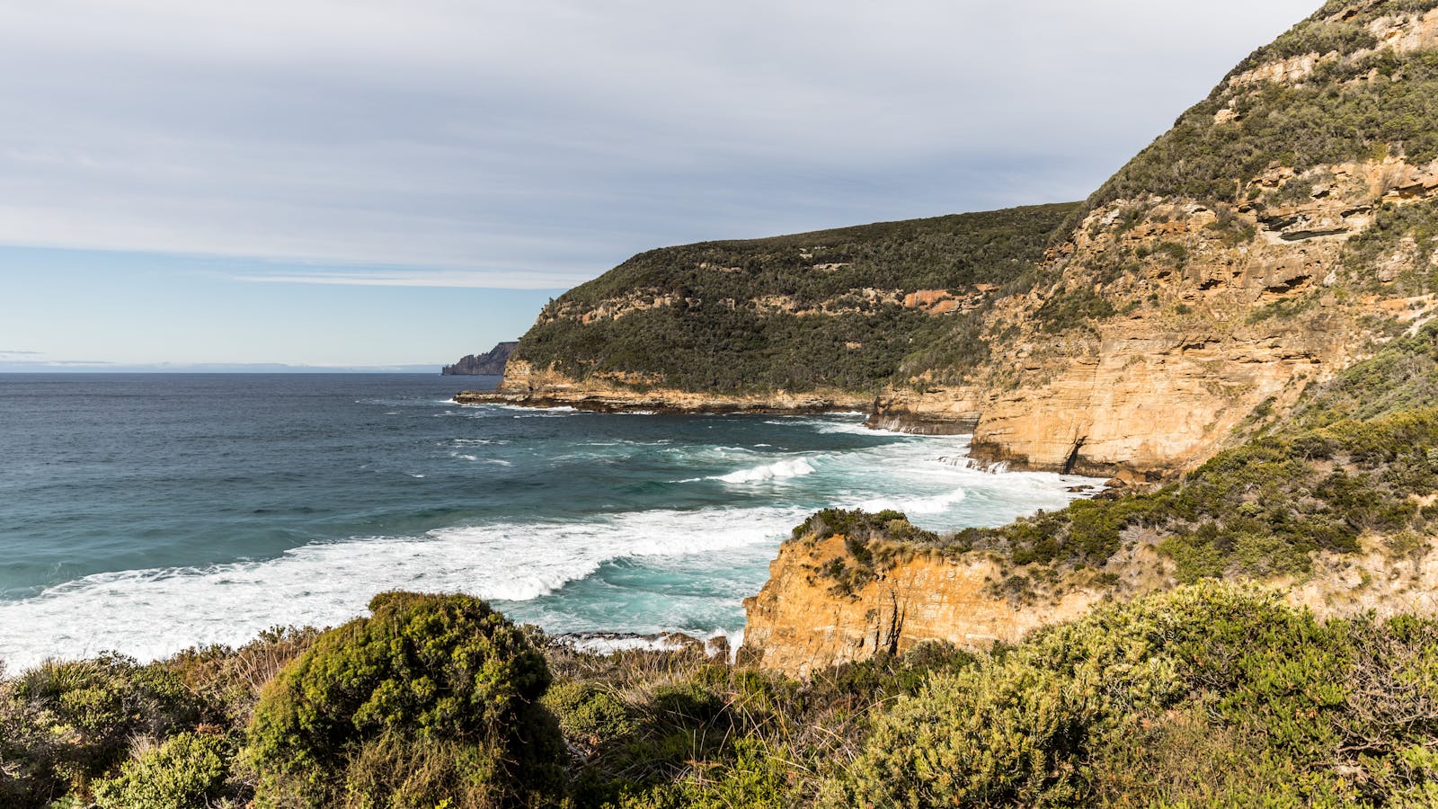 Gaze west over the ocean and you will see the spectacular sea cliffs of the Tasman Peninsula; none more spectacular than Cape Raoul on a clear day. The blowhole was formed when a sea cave collapsed leaving behind a deep, narrow sink hole. Puffs of sea mist can often be seen rising as the ocean crashes below. Return along the same track.