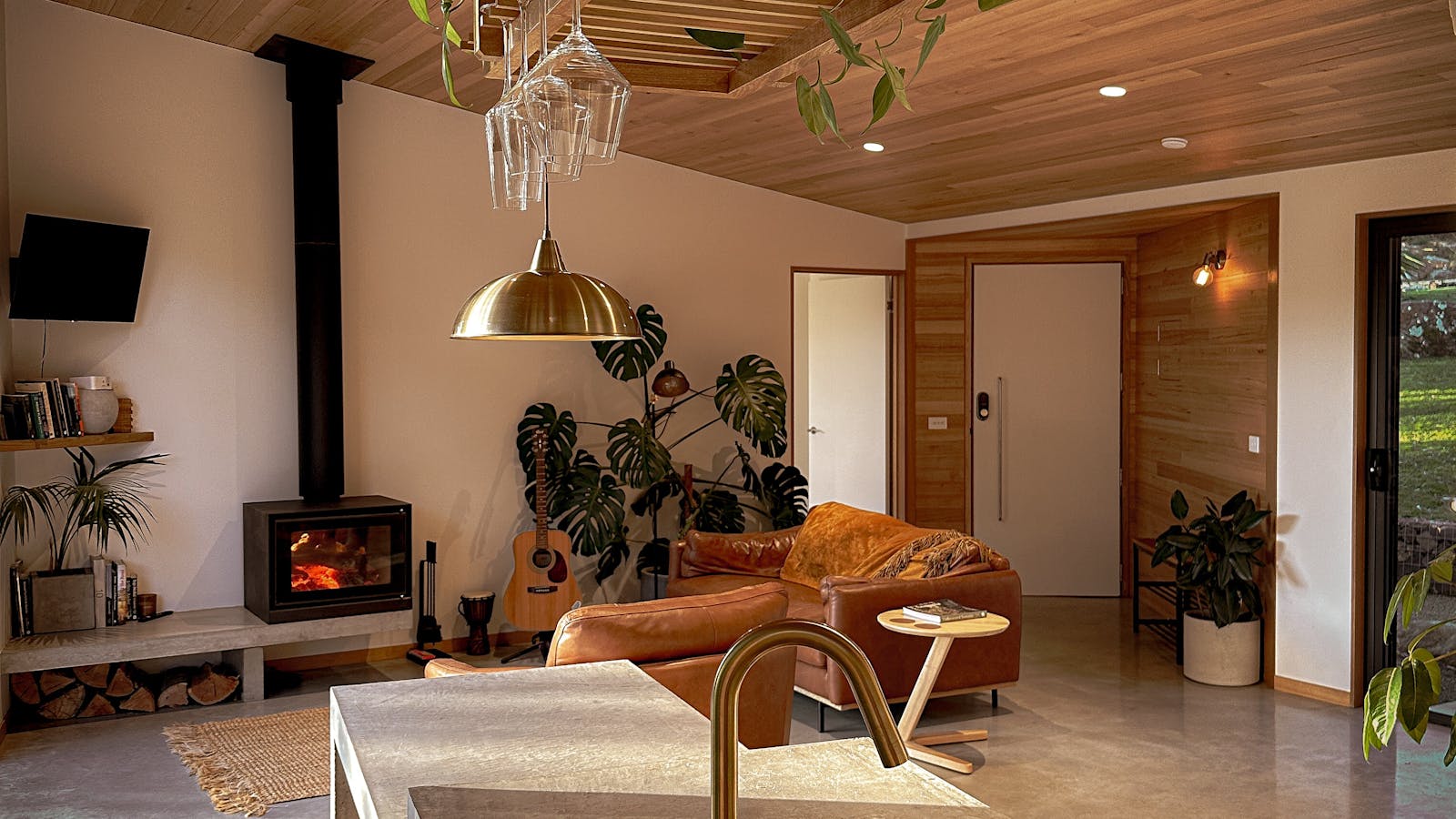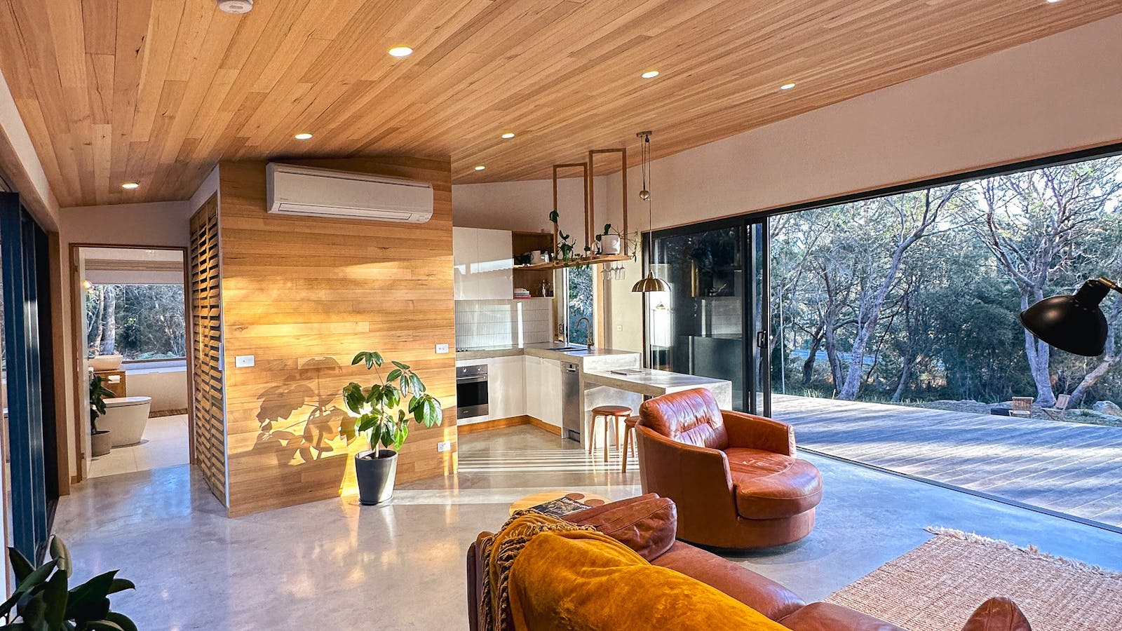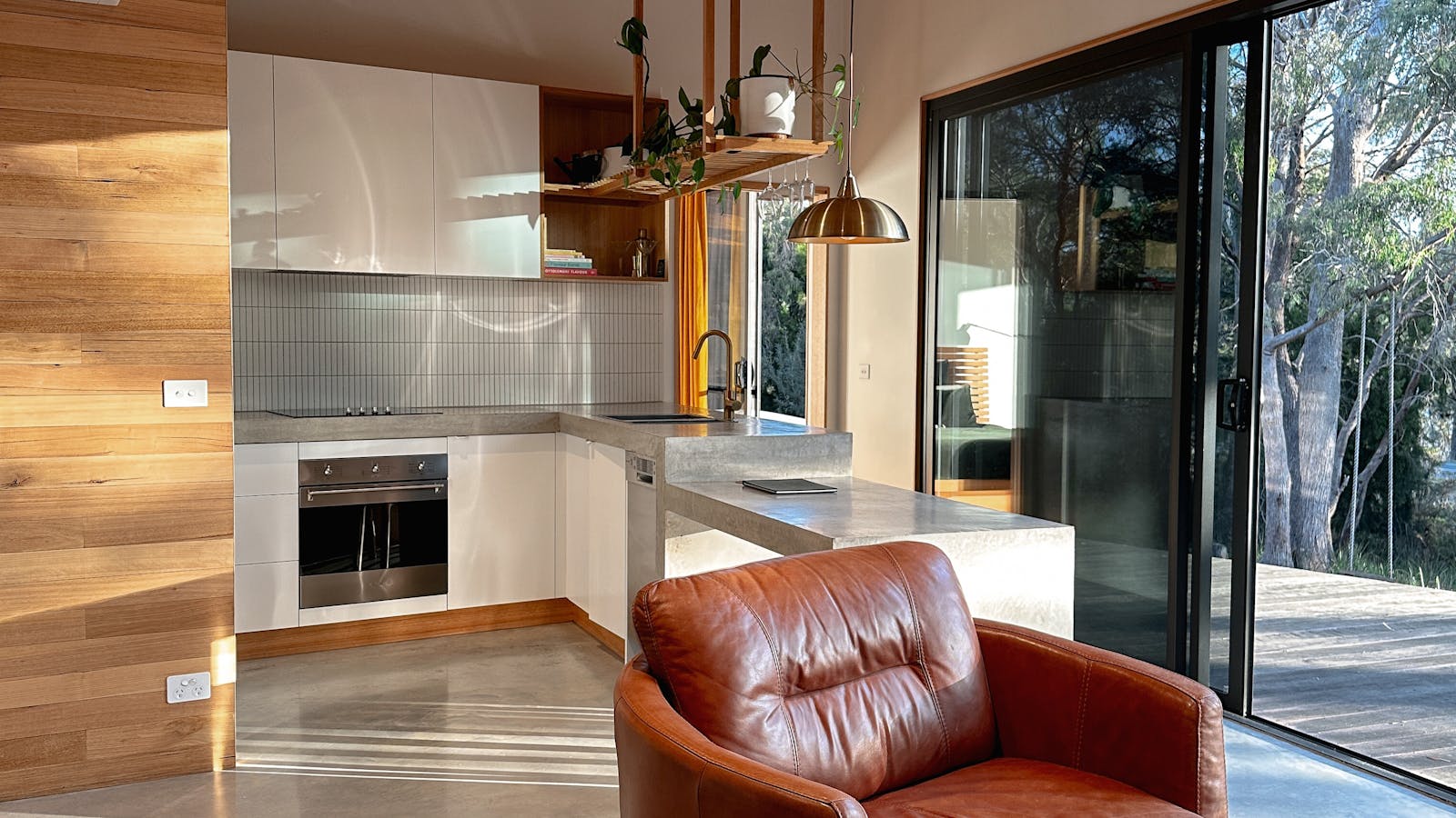 Tasmanian Oak paneling and polished concrete floors give the space warmth and grounding. Sliding glass doors open to a generous deck where an outdoor bath and firepit face the water, blurring the lines between inside and out.